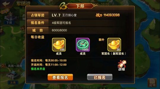军团战开始前十分钟,玩家可进入本军团报名的城池准备战斗。开战后会预留一段时间供军团成员加入战场。