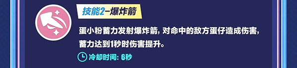 蛋小粉蓄力发射爆炸箭,对命中的敌方蛋仔造成伤害,蓄力达到1秒时伤害提升。
