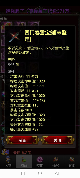等到我们可以打西门春雪了,会爆出来一种“西门春雪的宝剑”,武阳,魔宠岛和蜀山爆的一般都是需要80—90鉴定石的剑,这个时候不建议去鉴定。