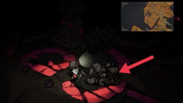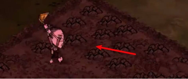 2、二层洞穴的入口通常在离一层洞穴入口不远的地方,而且一定会有以下特征:在遍布矿石的土黄色地皮上面。周围一定被蜘蛛围绕。兔人和石头龙虾也住在旁边。