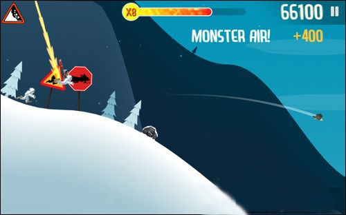 出现几率仅次于企鹅,刚骑上的时候跑得速度很快,但受到一次冲击后,就会变成滑雪模式,在滑雪模式下,假如再擦到一头企鹅,就会将之带在身边,可以为你抵消一次冲击。不过你最多只能带一头企鹅,加上雪人可以为你抵消两次冲击。不过雪人动作比较迟缓,你假如想借助它来翻跟头往往结果会是摔一个狠跤。