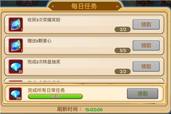 日常任务能够获得游戏内主要的消耗品:钻石、斗技场门票以及许愿水晶。并且完成所有任务后会有200钻石的奖励,可以说是每天必做,下面就让小编为大家介绍一下游戏中的日常任务。