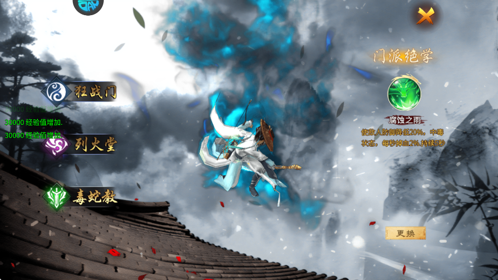 门派绝学:【腐蚀之雨】使敌人防御降低20%,中毒状态,每秒掉血2%,持续5秒