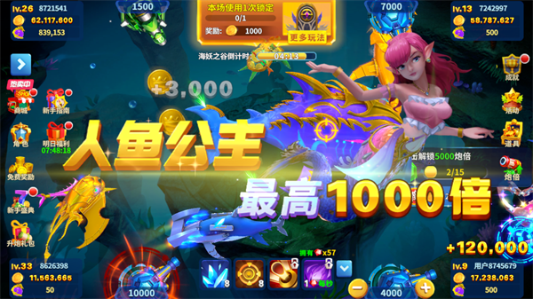 游戏中就有神秘莫测的美人鱼BOSS,其拥有一头火热的红发,红蓝相间的尾巴,身着像是晶莹海水般的露脐装,造型又萌又漂亮。美人鱼会出现在海盗宝藏、食人鱼谷、时光龙穴、机械迷城等场景模式中,是一个随机倍率BOSS。在击杀美人鱼BOSS后,神秘大转轮就会出现,300倍~9999倍随机奖励便会从天而降。美人鱼BOSS能够带来如此令人心动的奖励,自然是玩家激烈争夺的对象。然而很多玩家在捕获美人鱼的过程中,子弹耗尽也没有收获,那究竟该如何捕获美人鱼BOSS呢?