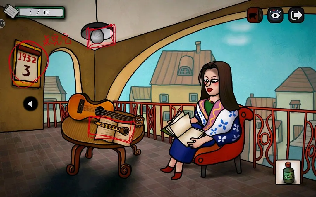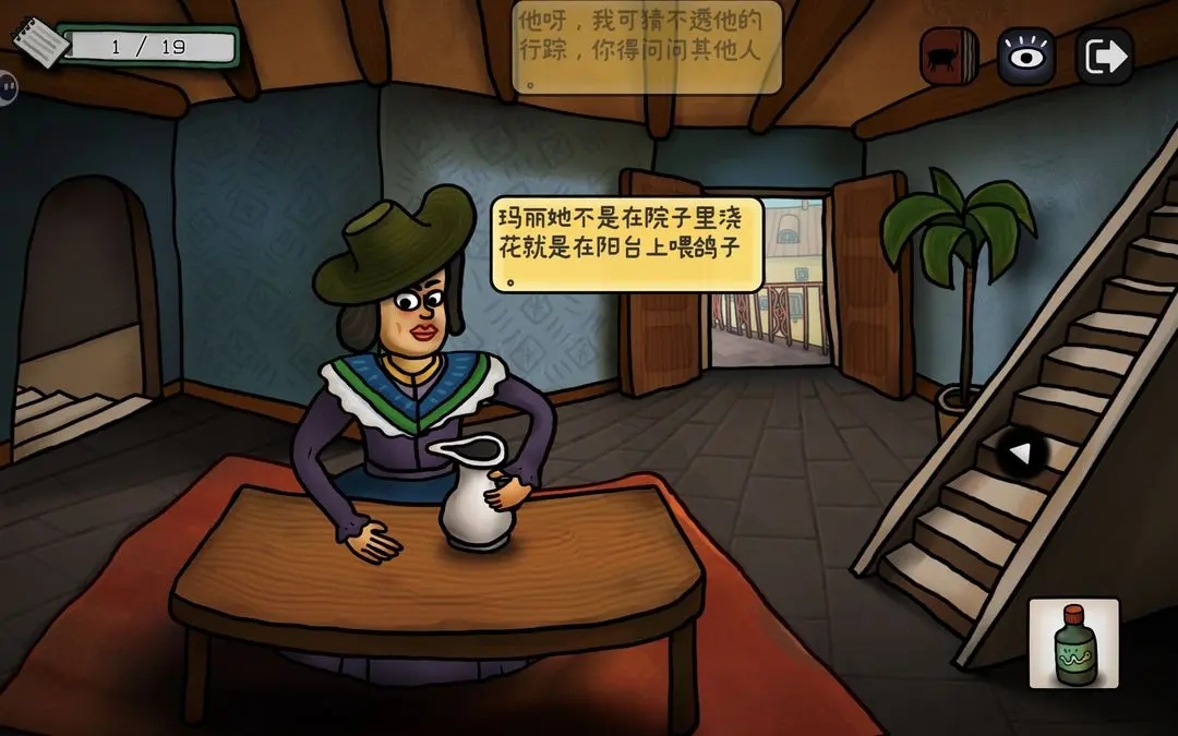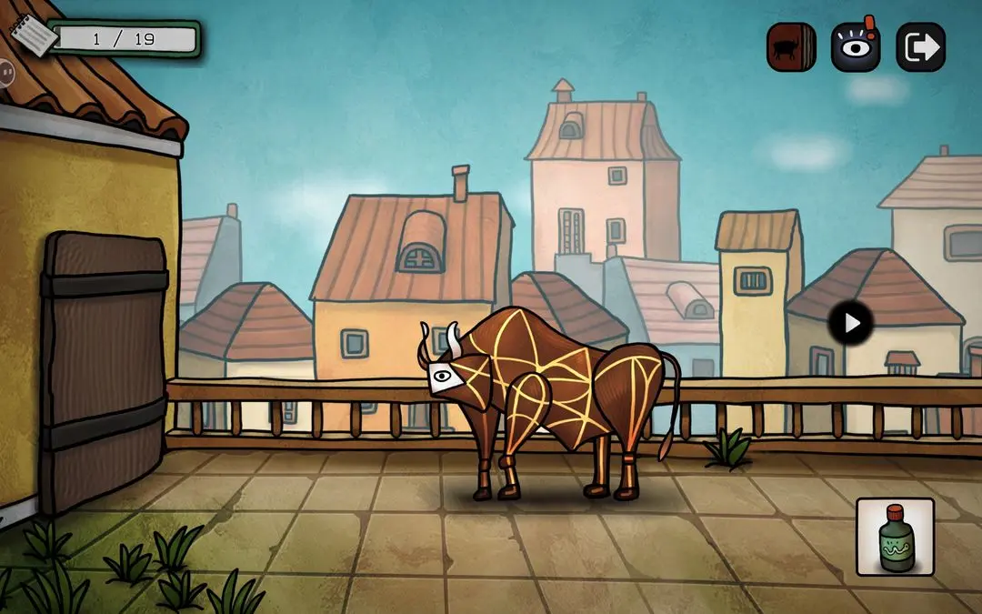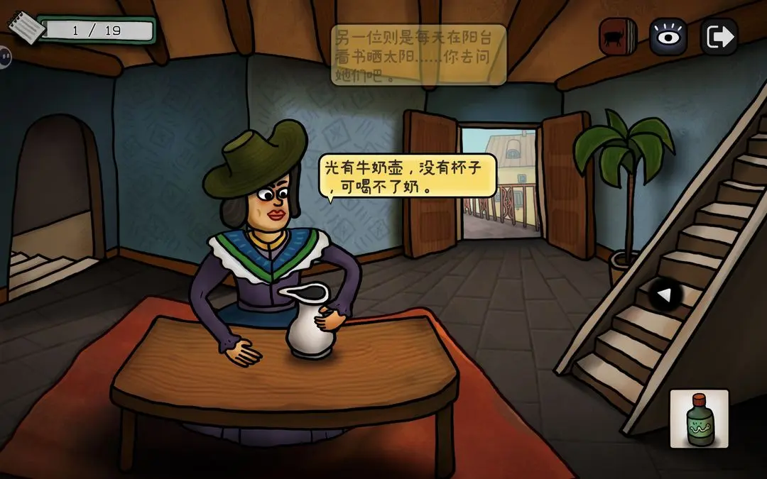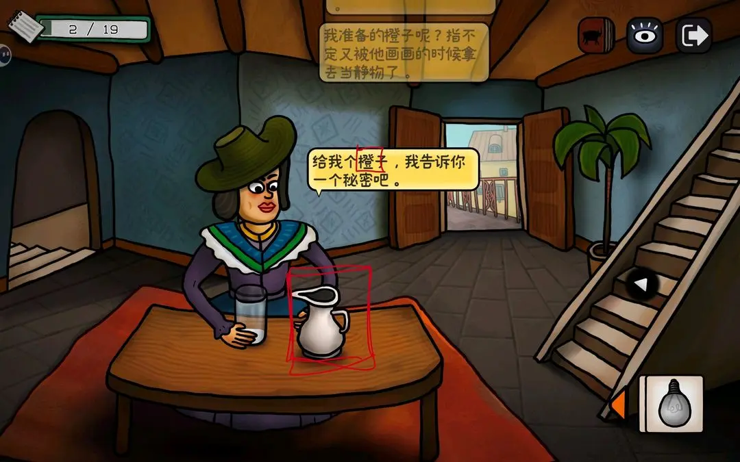 左键,看到阳台上的公牛,把画笔给它,出现铅笔气泡框