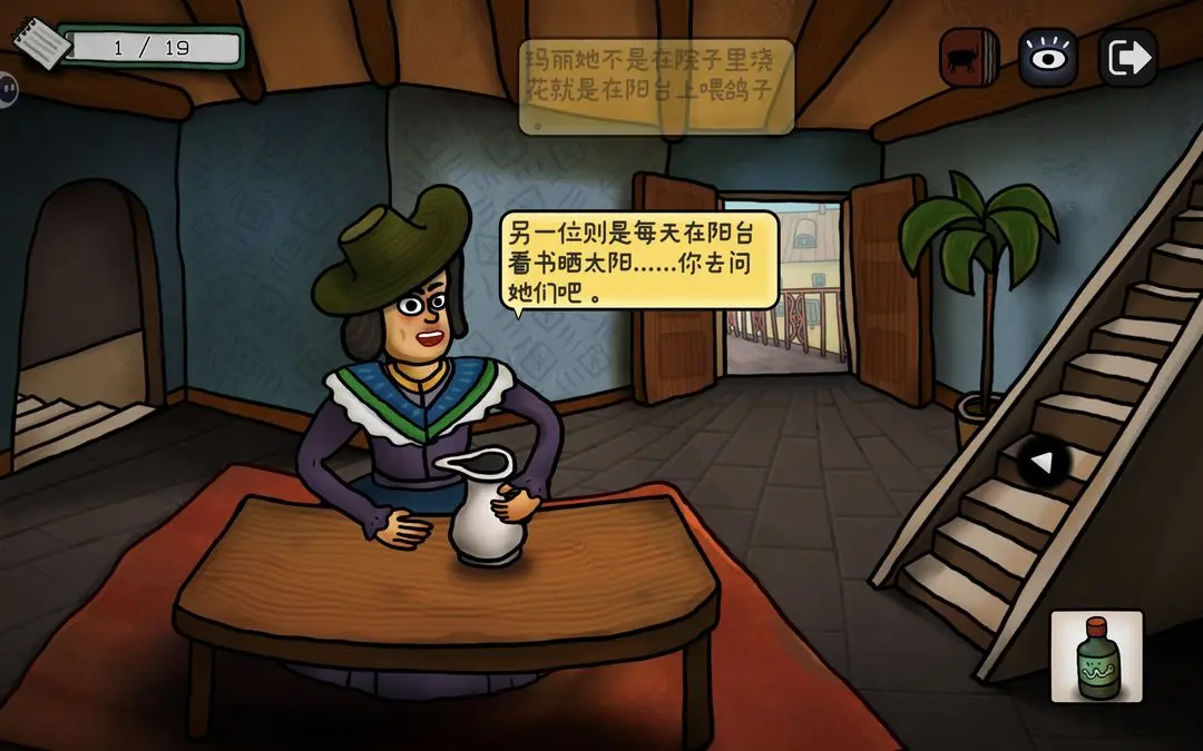 和女人对话,得到提示:浴室门9:55开,阳台上的鸽子要喂,另一个女孩在阳台看书,女人还需要一个杯子