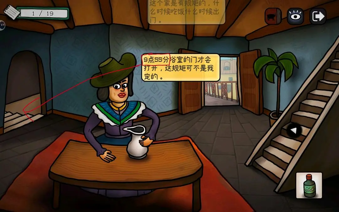 点击左边小门,把时间调到9:55,打开浴室门