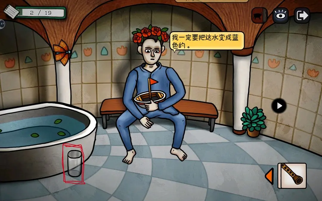 进浴室,拿走玻璃杯,和花环男对话,得知要把浴缸变蓝