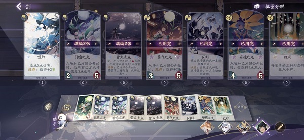 每个式神有多种不同效果的卡牌,这些卡牌决定了式神的战斗方式。随着游戏更新,每位式神的牌库也会不断更新。