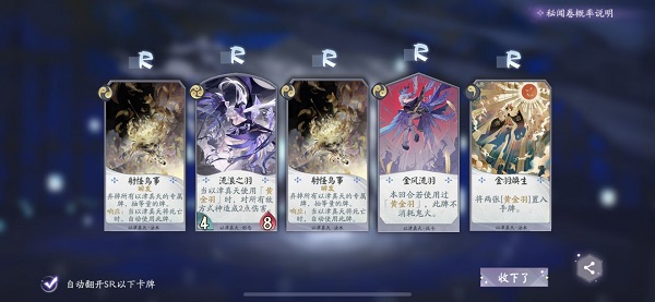 卡包在游戏中的名称为”秘闻卷”,每个卡包能够开出随机式神的随机五张卡牌。卡牌稀有度分为R卡、SR卡、SSR卡,概率分别为60%、34.5%、5.5%。
