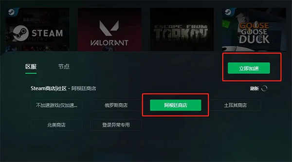1、先确定好想要注册的区服,如阿根廷,之后用加速器搜索“Steam”,选择“阿根廷商店”进行加速,加速之后启动Steam平台。