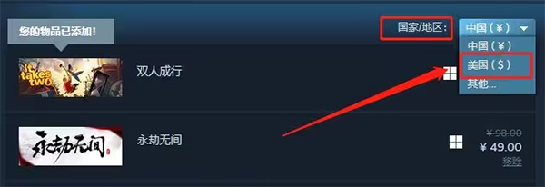 3、在购物车界面,点击国家/地区后面的“中国”,选择“美国”,之后再确认将地区改为美国。修改完成后,就表明已经将Steam修改成美区了。