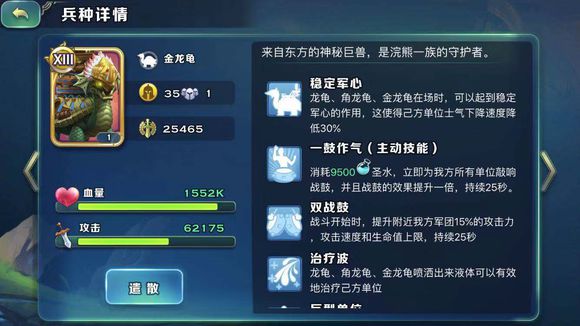 当然阿咚的作用也不仅仅如此,阿咚的第三个buff技能战鼓奥义,是面向全种族的加成,在触发专长“莫问吉凶”时,给我方部队带来额外加成,虽然加成只能持续10秒,增益效果也依次衰减(最多是18% 9% 4.5%),并且在触发占卜之后也存在cd,不能立即充能(楼主测试,这个cd是在6秒左右),但如果使用的好,加成效果也非常可观。