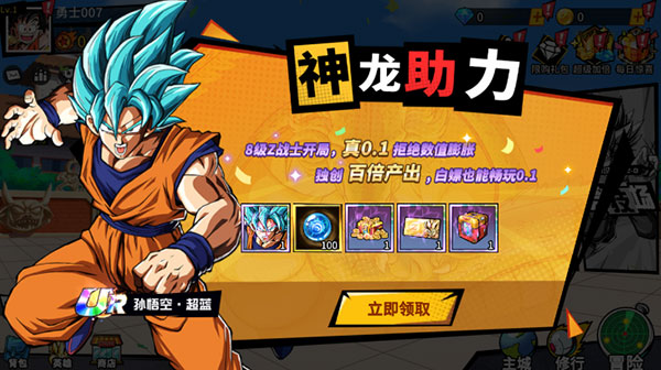 1、打开游戏后,可以直接领取UR孙悟空·超蓝,前期直接乱杀。