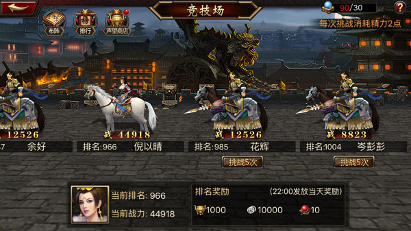 在挑战其他你以及每日结算时,你可获得声望点数奖励。声望点数可以用于在声望商店中兑换各种资源道具,更能够兑换稀有的橙将、红将碎片。