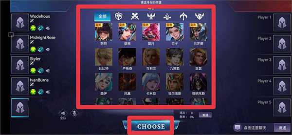 4、接着进入到选英雄环节,在中间选择你拥有的角色并点击CHOOSE选定角色