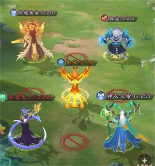 神煞阵型:前排白虎,轩辕,中排朱雀,后排神农和东皇太一