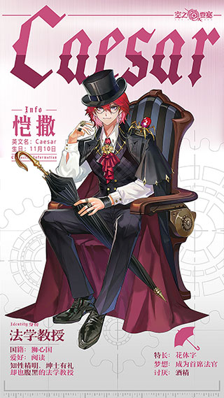 出身狮心国贵族博尔吉亚家族的法学教授。恺撒是家族第一个选择涉足法律领域,而他做出这种选择的目的,却不足为外人道也……恺撒是家族最优秀的继承者,自幼经受贵族精英教育的他,面对各种情况都游刃有余。在他的眼里,任何事物没有绝对的对错,只分价值的高低。