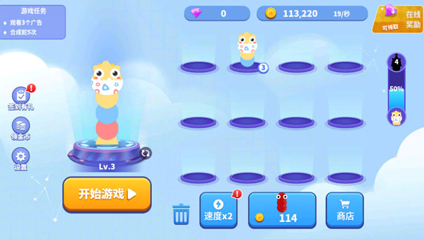 想拥有各种各样的小蛇?轻轻挪动手指,把相同的小蛇合成起来,解锁更多更强的蛇蛇!