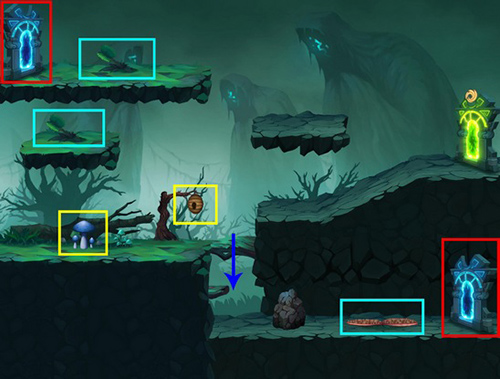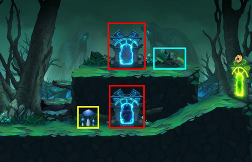 注意事项:有1棵毒蘑菇和1棵捕蝇草。下方概率出现1棵食人花。两个红框位置随机出现1-2个蓝门,下方绿框内概率出现箱子或幻兽其中之一,中部绿框概率出现紫门。