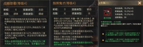 被动:【指挥鬼才】提升【意大利炮】的伤害和覆盖范围