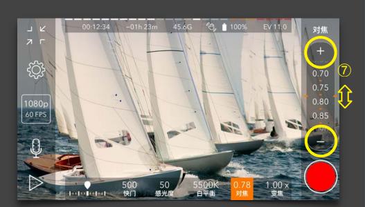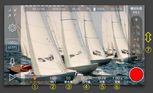 使用①~⑥来查看相机参数,选择其中一项然后用⑦来调整。