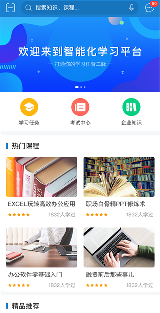 智能化学习平台首页,含学习任务、考试中心、企业知识入口及热门课程推荐。