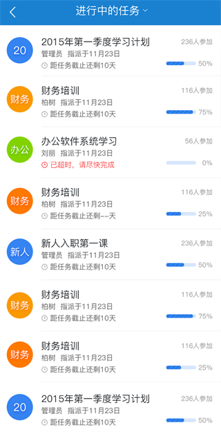 呈现 “进行中的任务” 列表,包含任务名称、参与人数、进度、截止时间等信息。