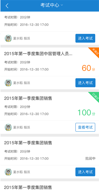 显示不同考试的时限、时间、指派人和考试状态,点击可进入考试。
