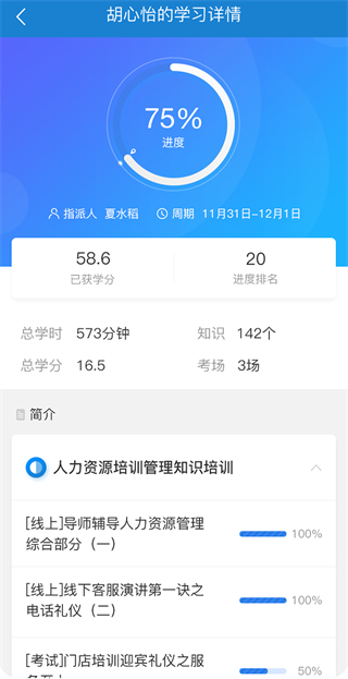 能展示员工个人的学习进度、已获学分、总学时、掌握的知识数量、参与的考场数等详细数据,还可查看具体课程的完成情况,便于员工和企业了解学习成效。