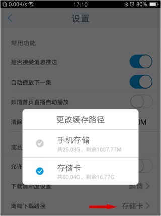 Android:进入客户端 -> 左下角“我的” -> 右上角“设置” -> “离线下载路径”,可修改为手机存储或存储卡。已存储卡为例,下载路径为: