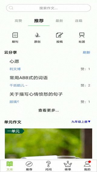 2、来到了主页面文库,这里有非常多的不同种类的作文,我们可以随时学习。