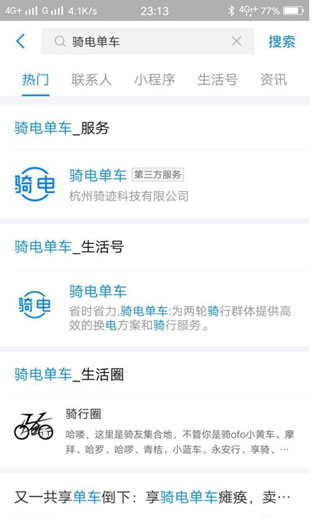 1.打开支付宝,在搜索框搜索骑电单车,会出来这样一个页面