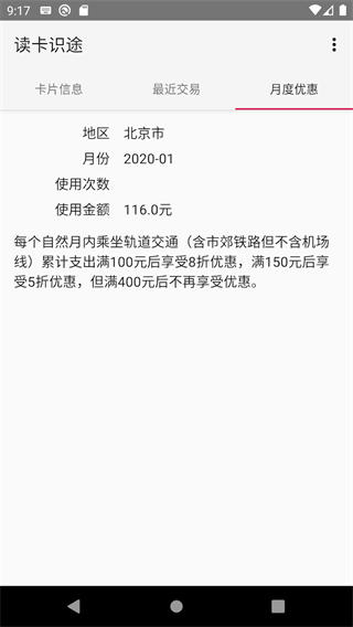 2、读取后,在【卡片信息】页可查看卡名、类型、发卡地、卡号、余额及有效期。