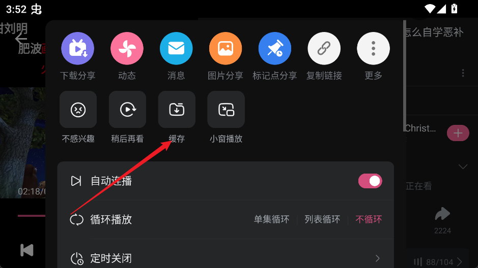 5、在弹出的功能列表里选择「缓存」,即可开始下载视频。