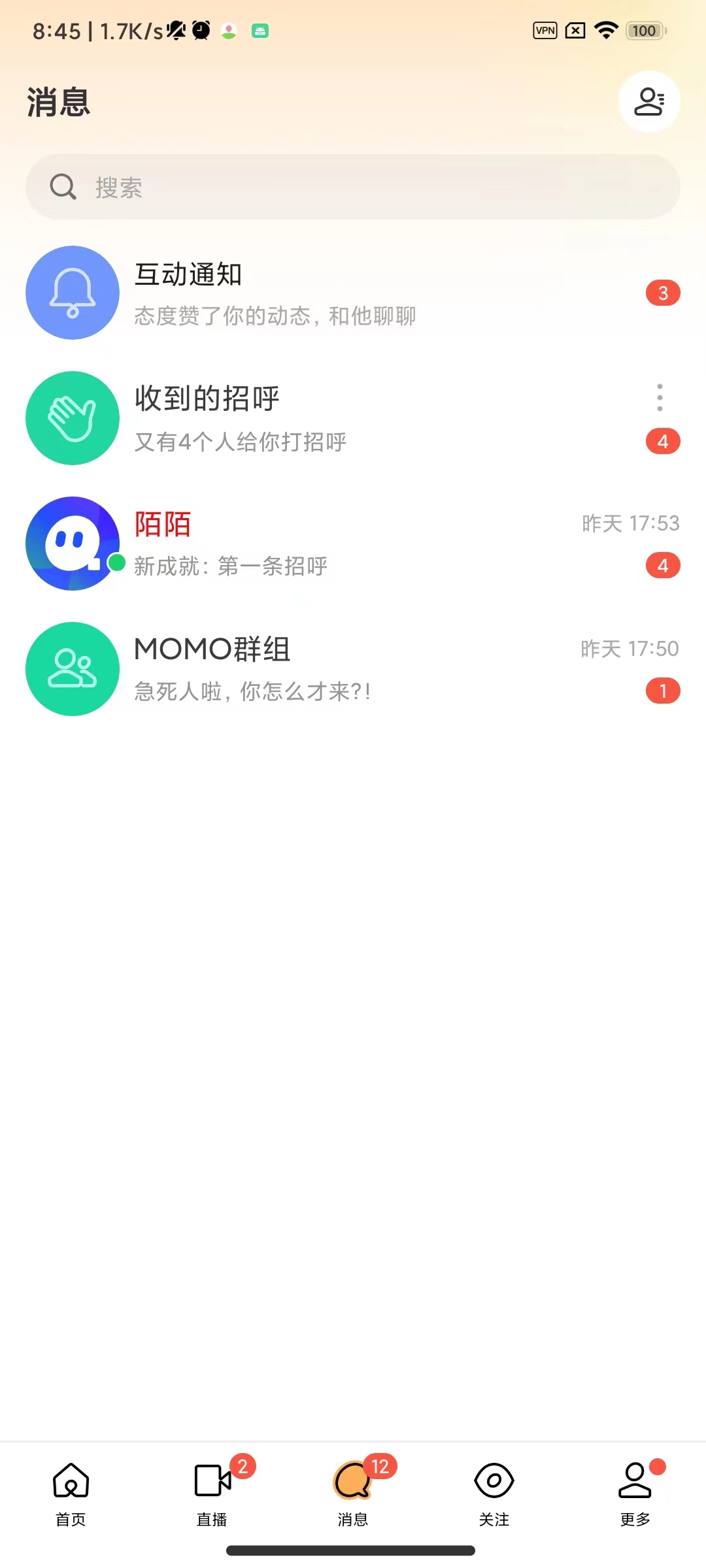 陌陌app免费版是一款超级受年轻人喜爱的社交软件,具有的社交功能是备受用户们喜爱的,让你可以使用它进行全新的社交体验,拥有它可以让你随时匹配符合你心意的那个ta,让你可以与ta实时在线互动聊天,即时收发文字、语音、图片或者视频语音通话等,并且还可以查找你附近的人,发布动态,看直播,帮你快速结识更多与你志同道合的朋友,感兴趣的话,不妨来这里下载陌陌app免费版试试吧。
