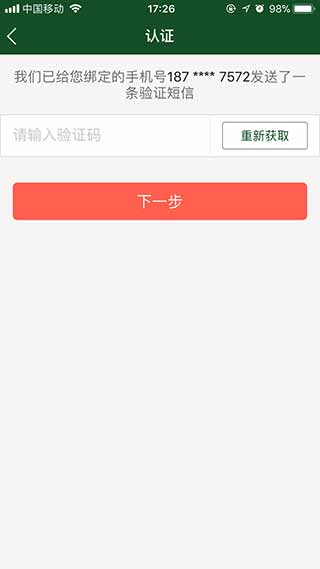 3、输入验证码后,点击下一步完成认证;