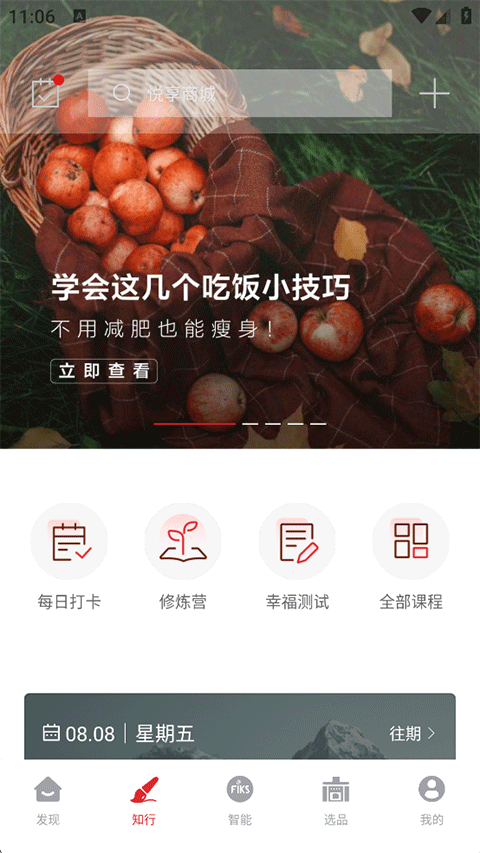 2、知行:每日打卡、修炼营、幸福测试及全部课程;