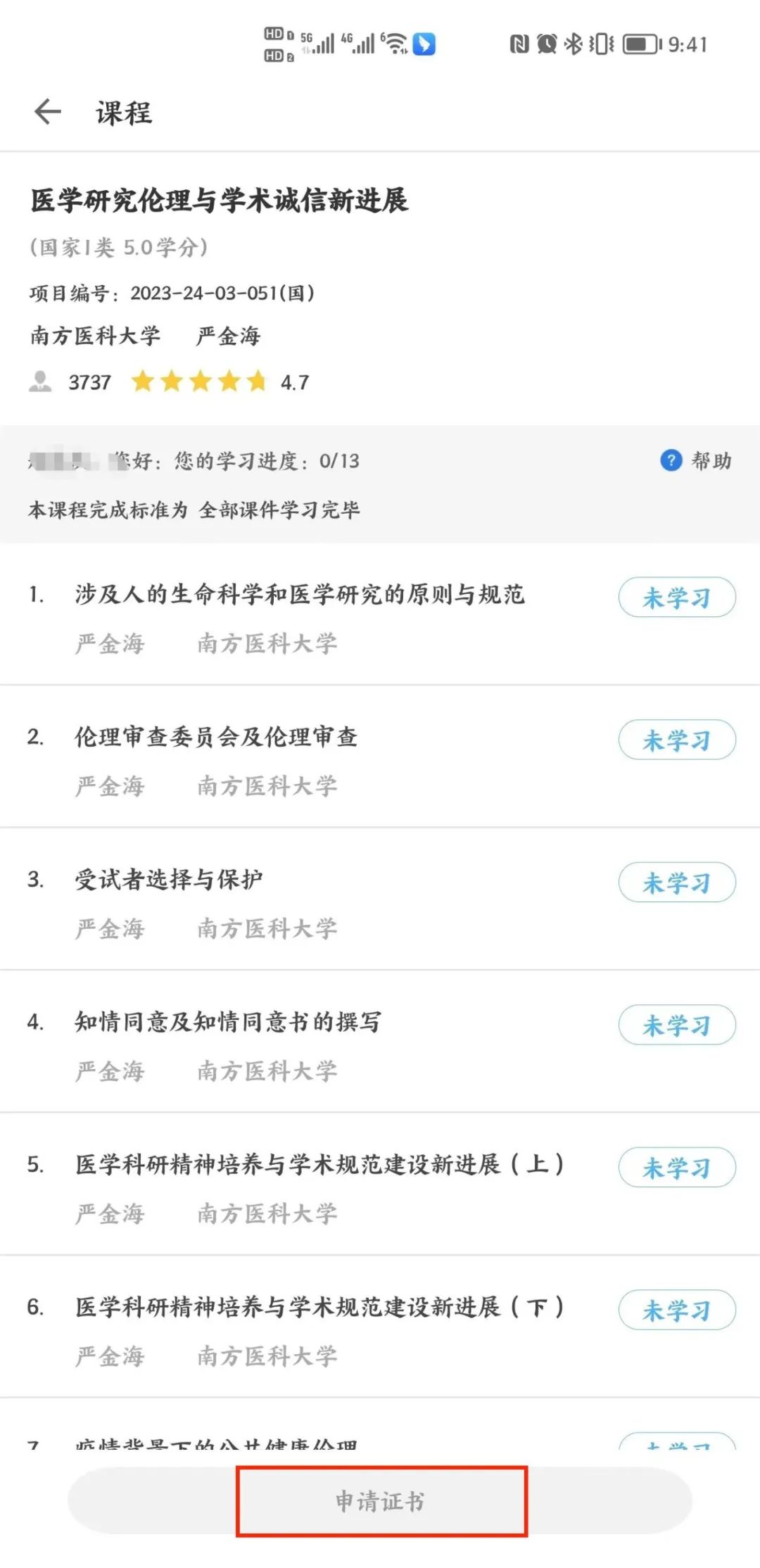 特别提示:继续教育项目内所有课程学习完毕且通过后考试后,需要点击“申请证书”才能获得此项目的学分。