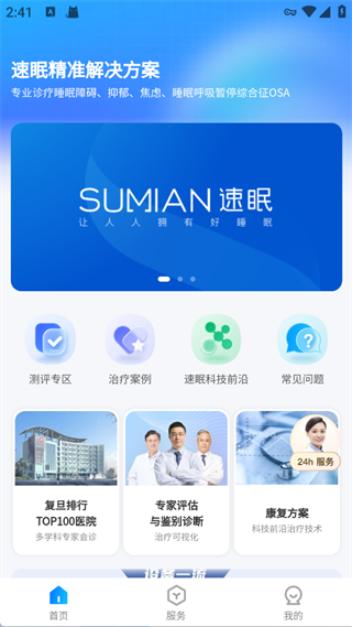 提供速眠精准解决方案,涵盖测评、案例、科技前沿、常见问题及医院、专家、康复方案等睡眠健康服务入口。