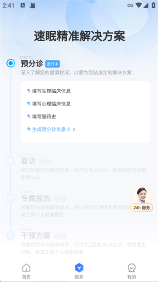 通过预分诊、首访、专属报告、干预方案为用户定制睡眠健康解决方案,更有客服24小时服务。