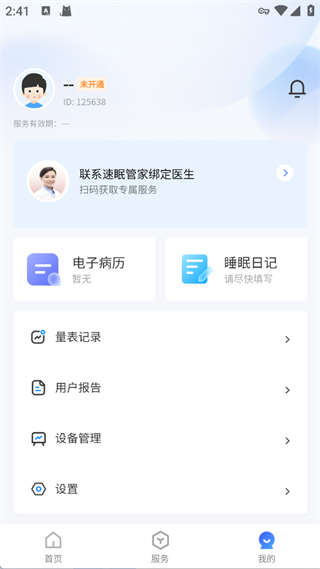 提供绑定医生、电子病历、睡眠日记、量表记录、用户报告、设备管理及设置等个人睡眠健康管理功能。