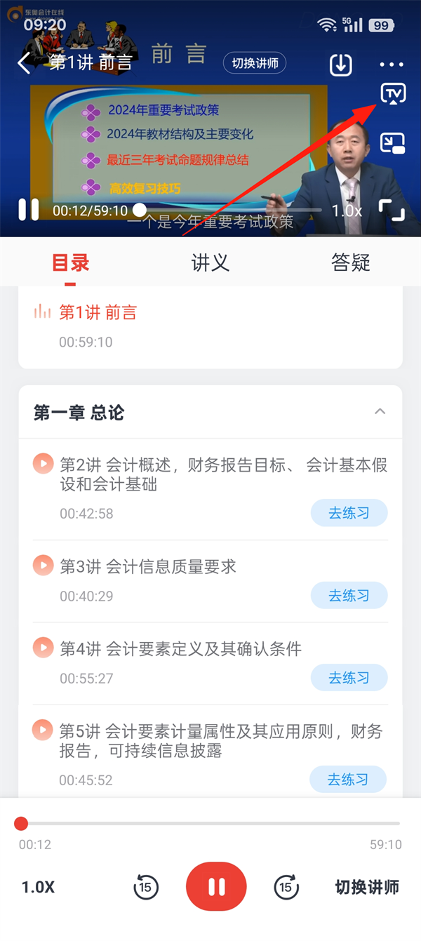 2、点击观看要 投屏 的学习视频,然后点击投屏图标