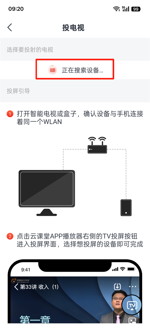 3、等待搜索电视设备,连接之后就可以在电视上观看了