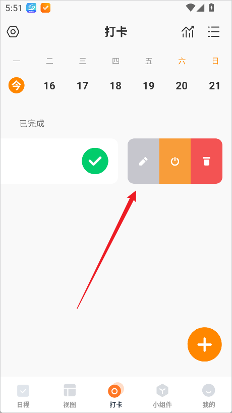 1、在打卡功能处找到需要设置时间段的卡片将其左滑。