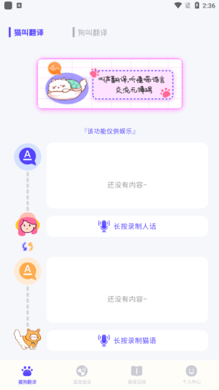 1. 人宠互译:一键把日常话语“翻译”成猫狗叫声播放,也能录音识别宠物叫声并给出情绪解读,让跨物种对话更有趣。