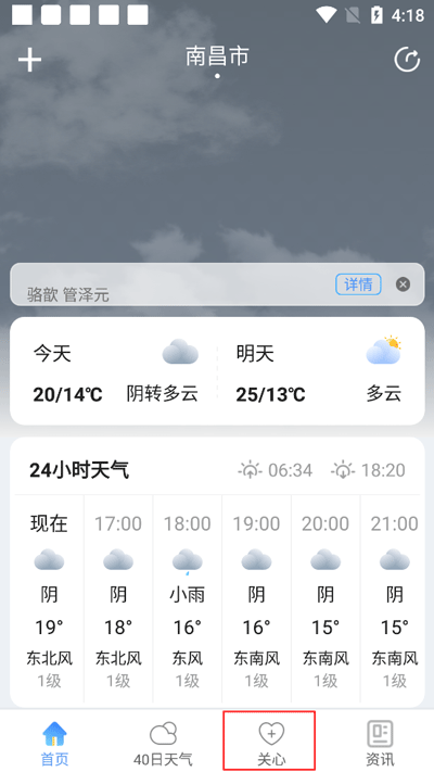 ④设置好后在“关心”页面就可以实时查看亲属所在地的天气状况了