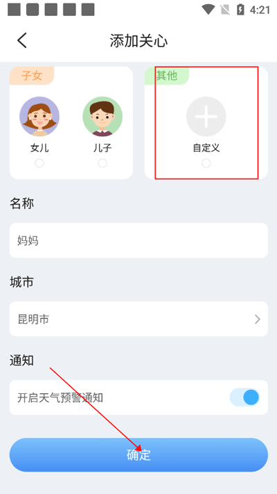 ③选择家人或者自定义,填写好名称以及选择好城市后点击确定