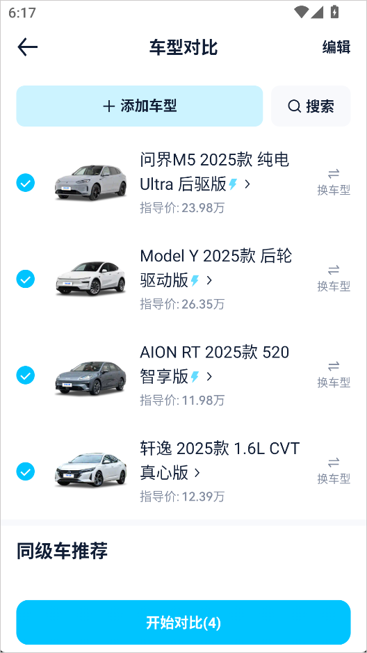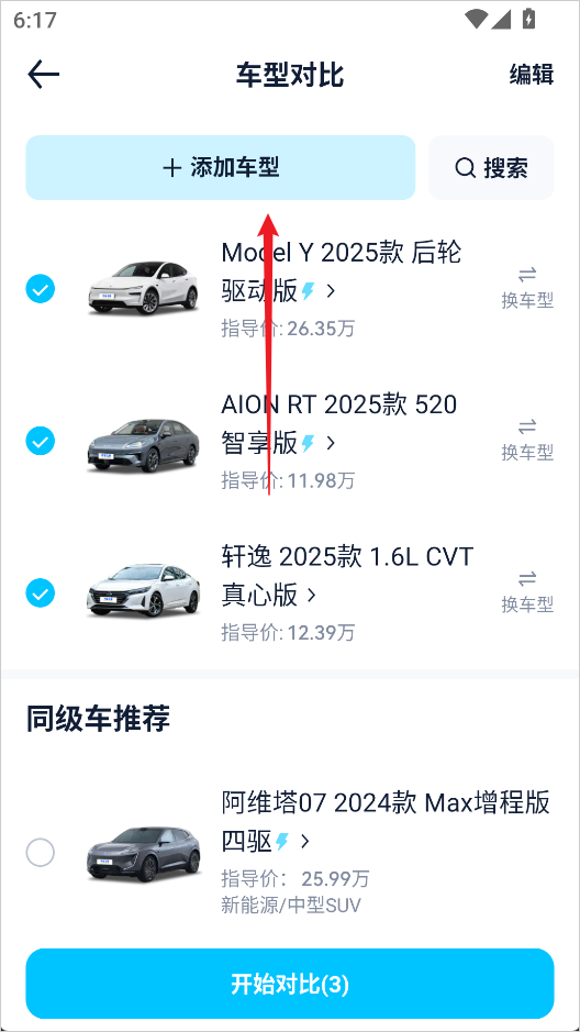 6、车型添加完成后,点击【开始对比】即可;