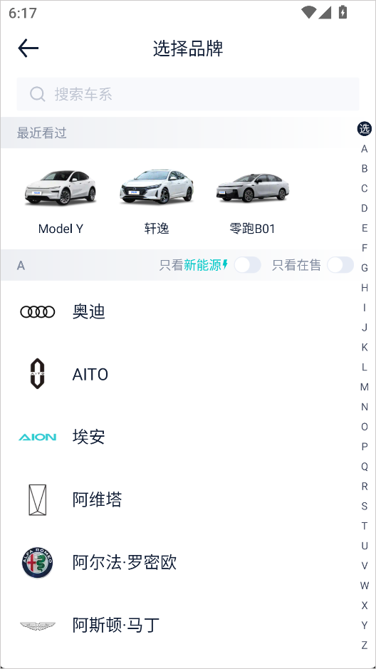 1、打开软件后,点击底部导航栏中的【选车】功能;